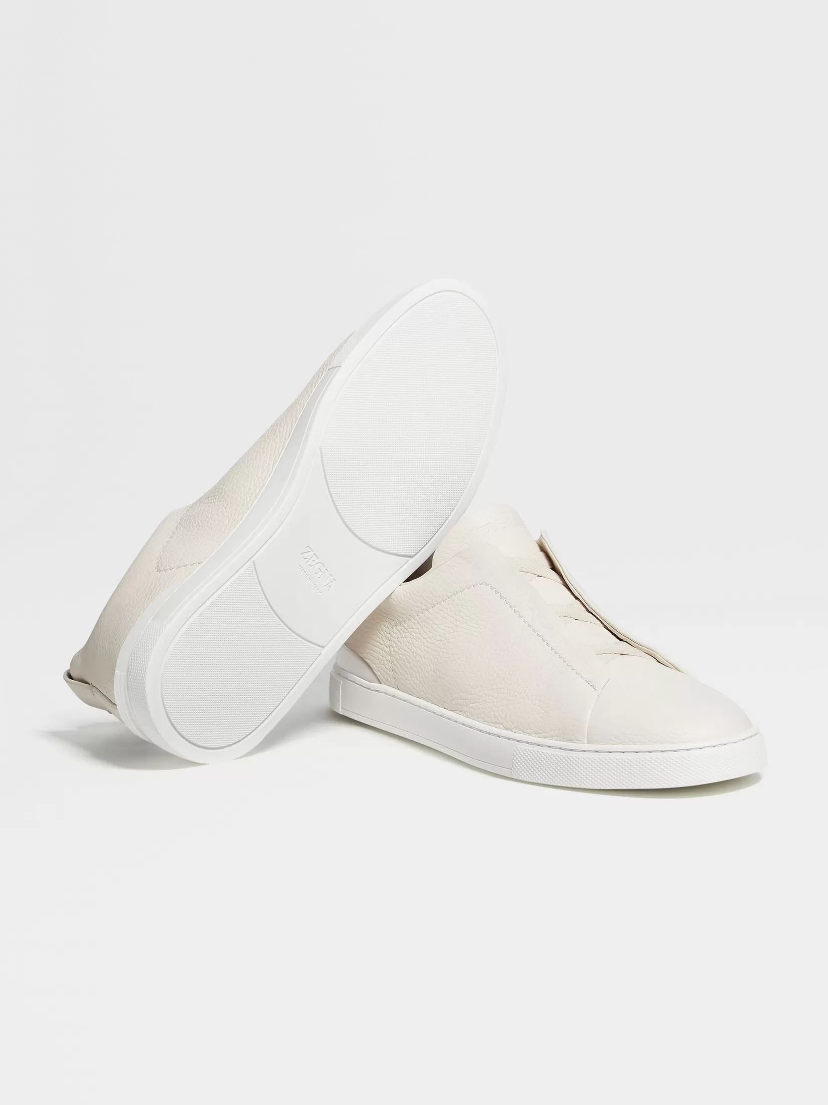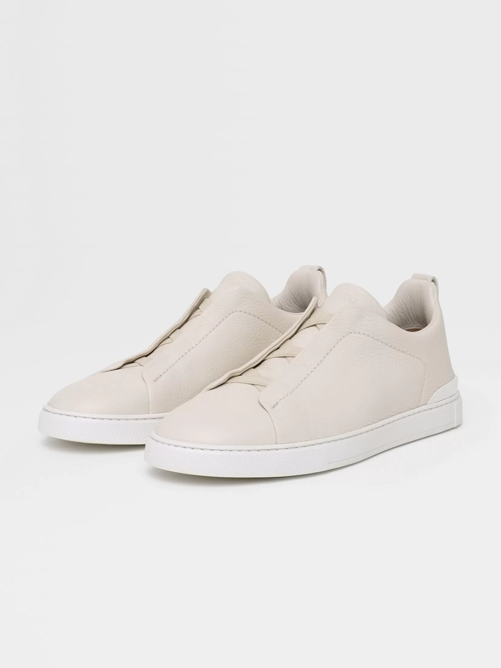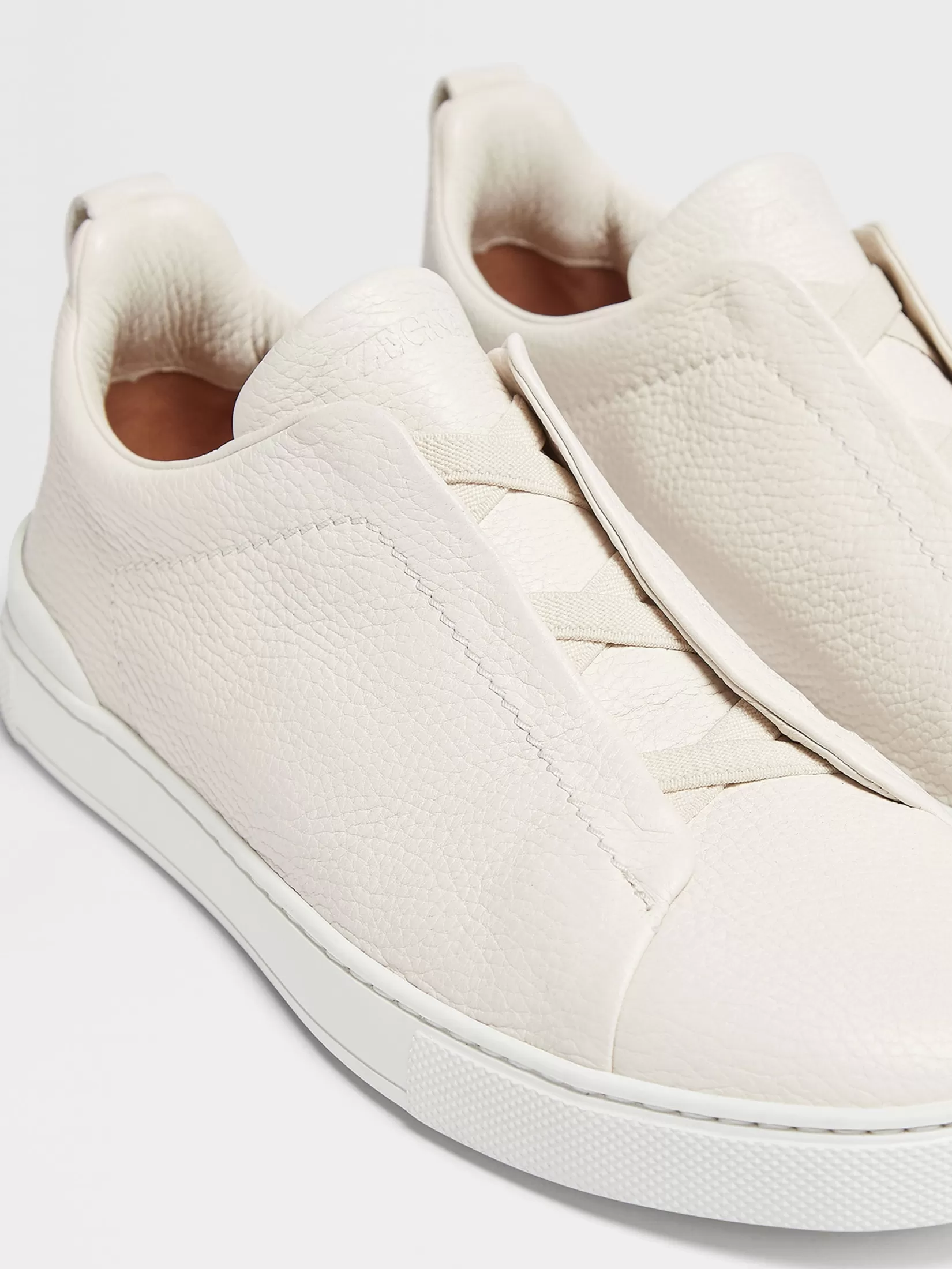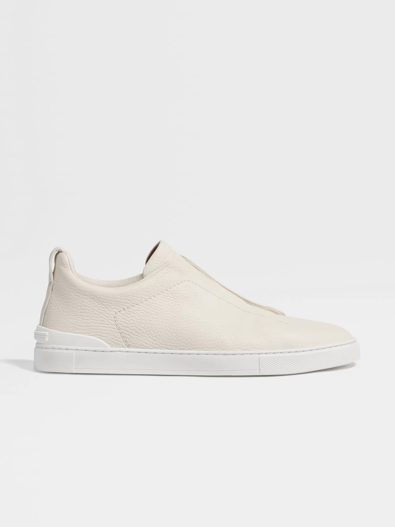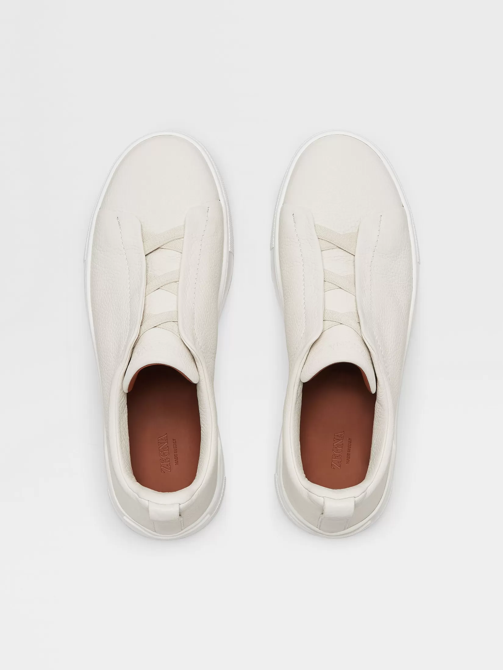 Las zapatillas bajas Triple Stitch™ en piel de ciervo blanco marfil se asientan sobre una suela de goma extraligera de color blanco. Las icónicas tres cruces elásticas le proporcionan una calzadura simple y fácil, a la vez que evocan los tradicionales pespuntes a mano de las chaquetas sartoriales; un homenaje al legado en la alta costura de Zegna. El forro de piel en color Foliage completa su diseño.