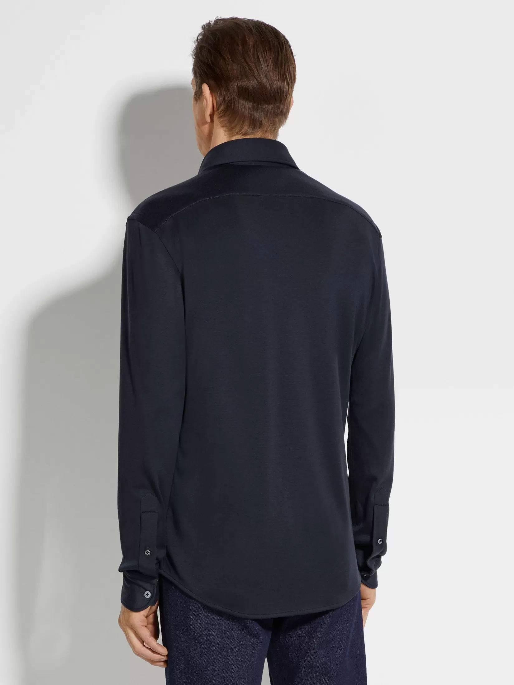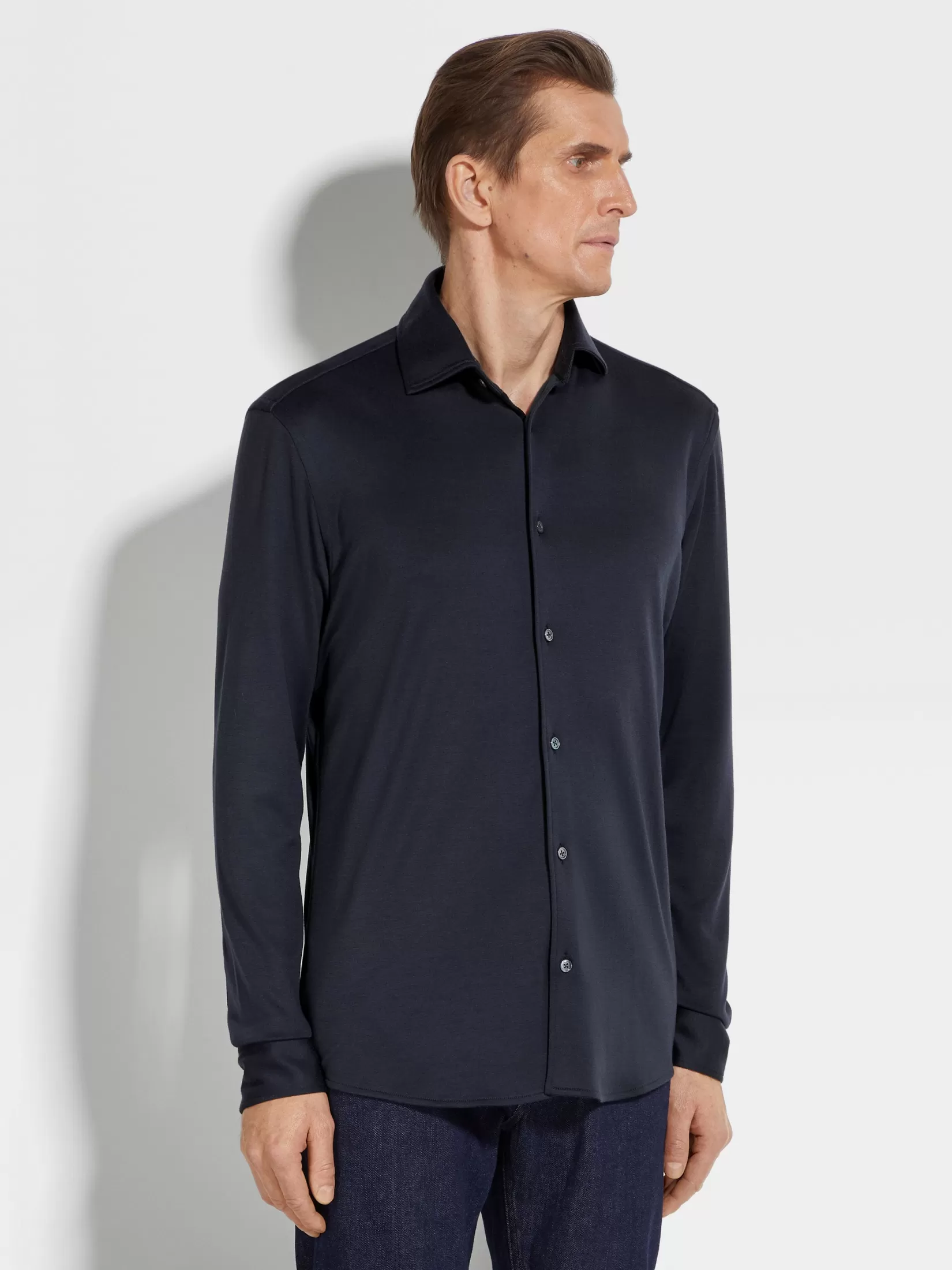 Los tejidos de lujo marcan la diferencia en la ropa informal pero elegante, como en esta camisa azul marino que combina la bonita cachemira y la seda ligera en un diseño cómodo. Esta camisa de manga larga está acabada con el clásico cuello y los puños de camisa.
