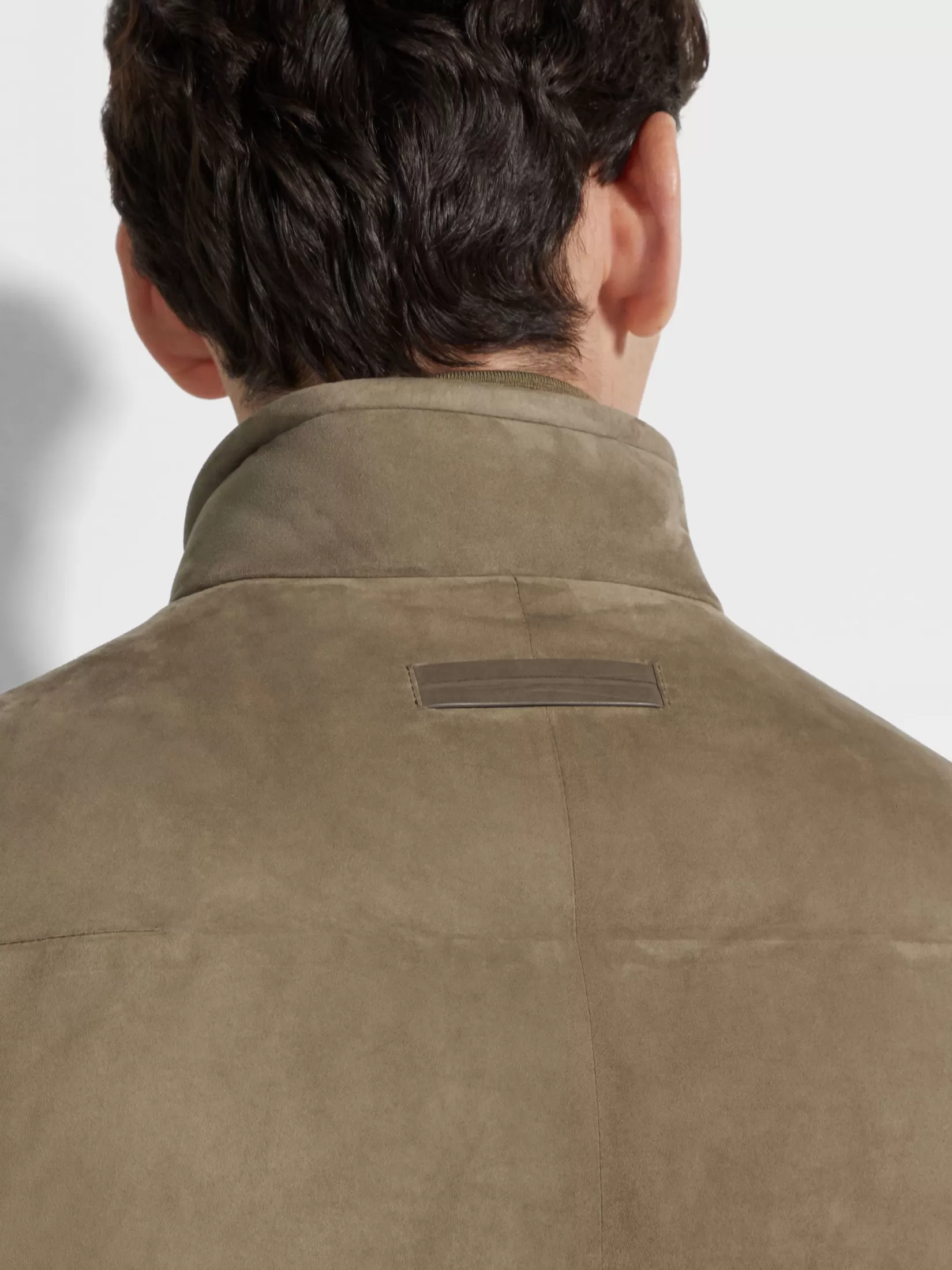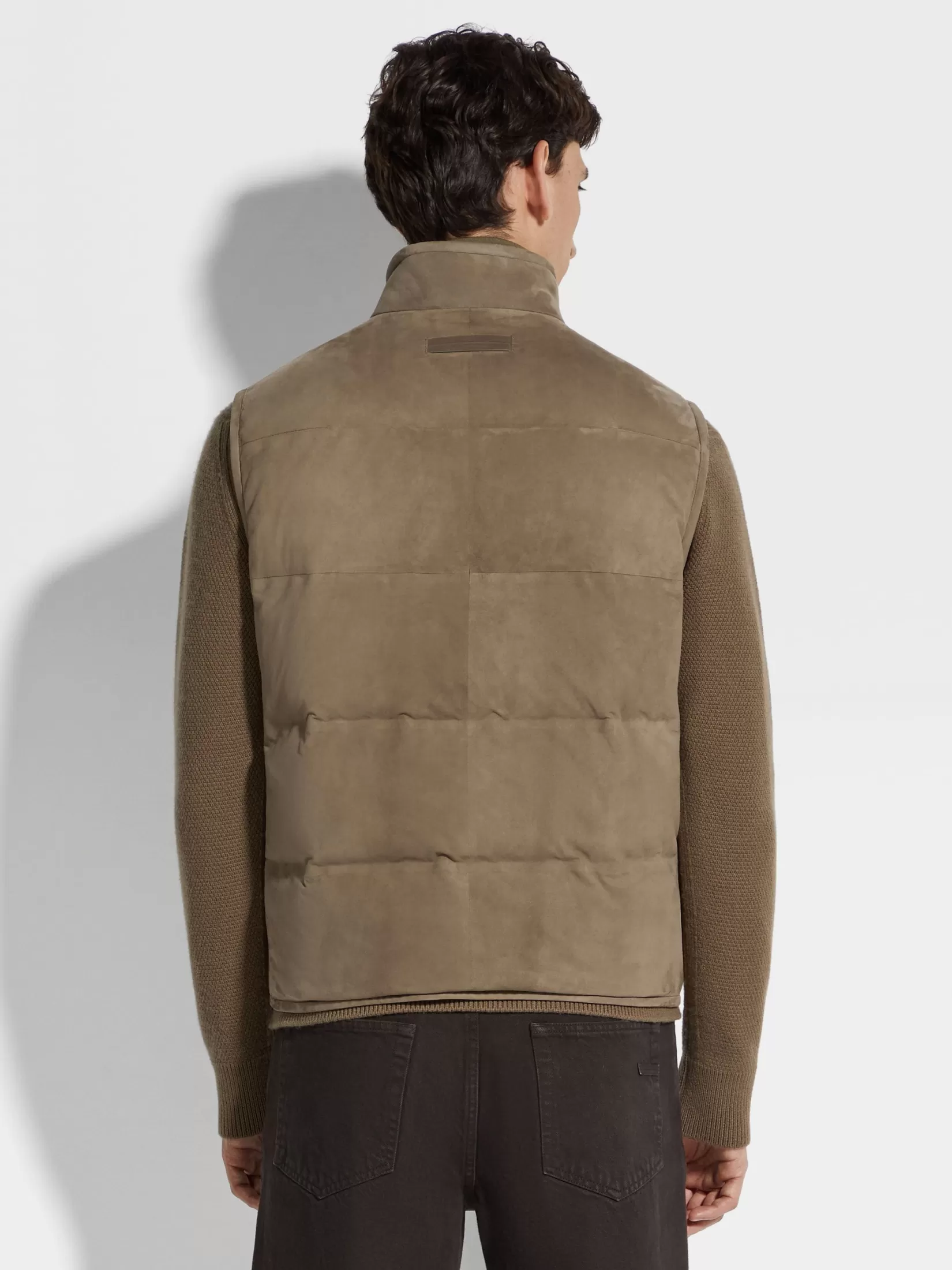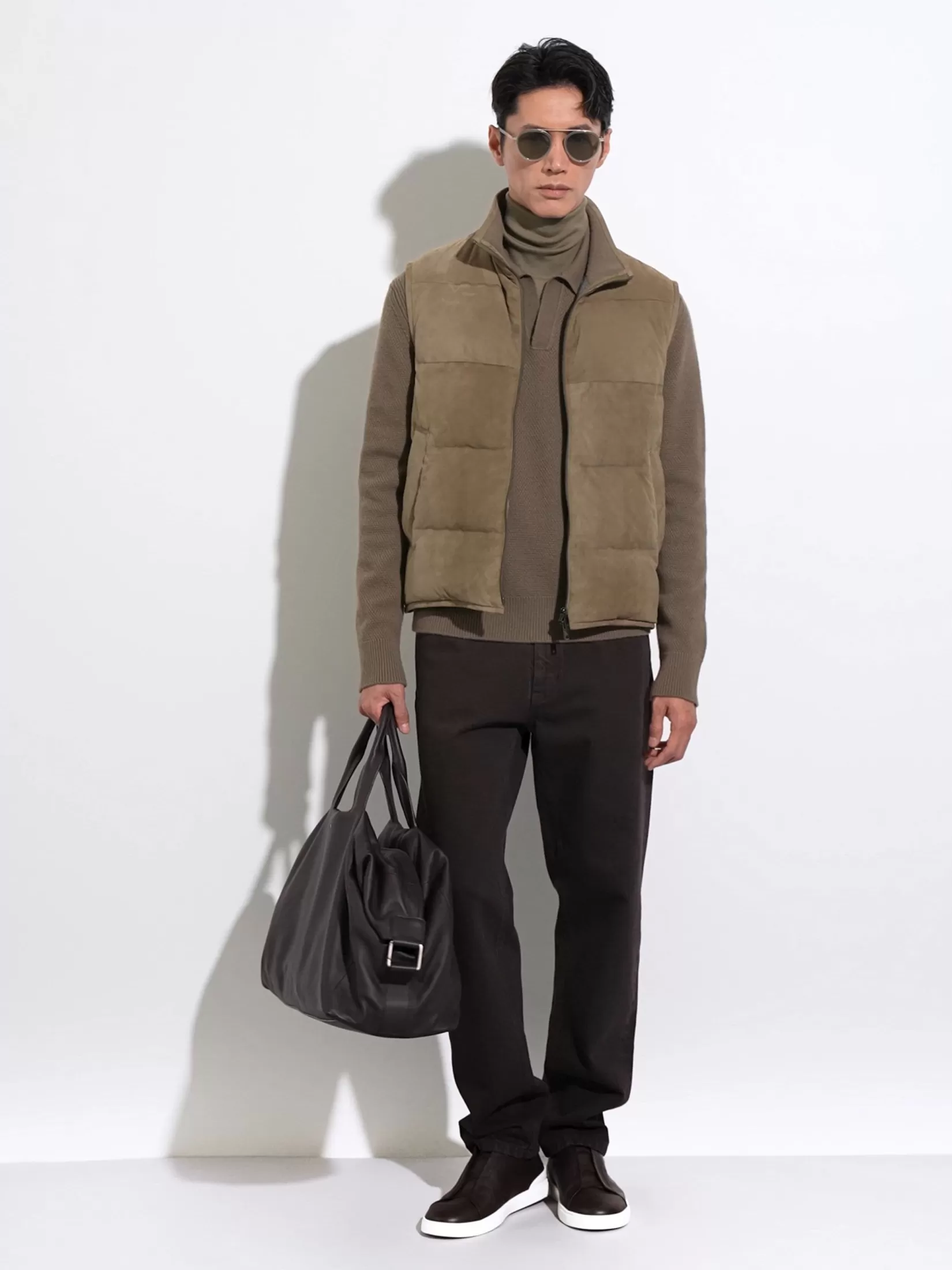 Este chaleco de ante color caqui es suave y liso al tacto, gracias a la calidad inconfundible de su lujosa confección en piel de cordero. El chaleco acolchado se cierra con cremallera y está acabado con un cuello mao. Lo detalles termosellados en los bolsillos completan su diseño esbelto.