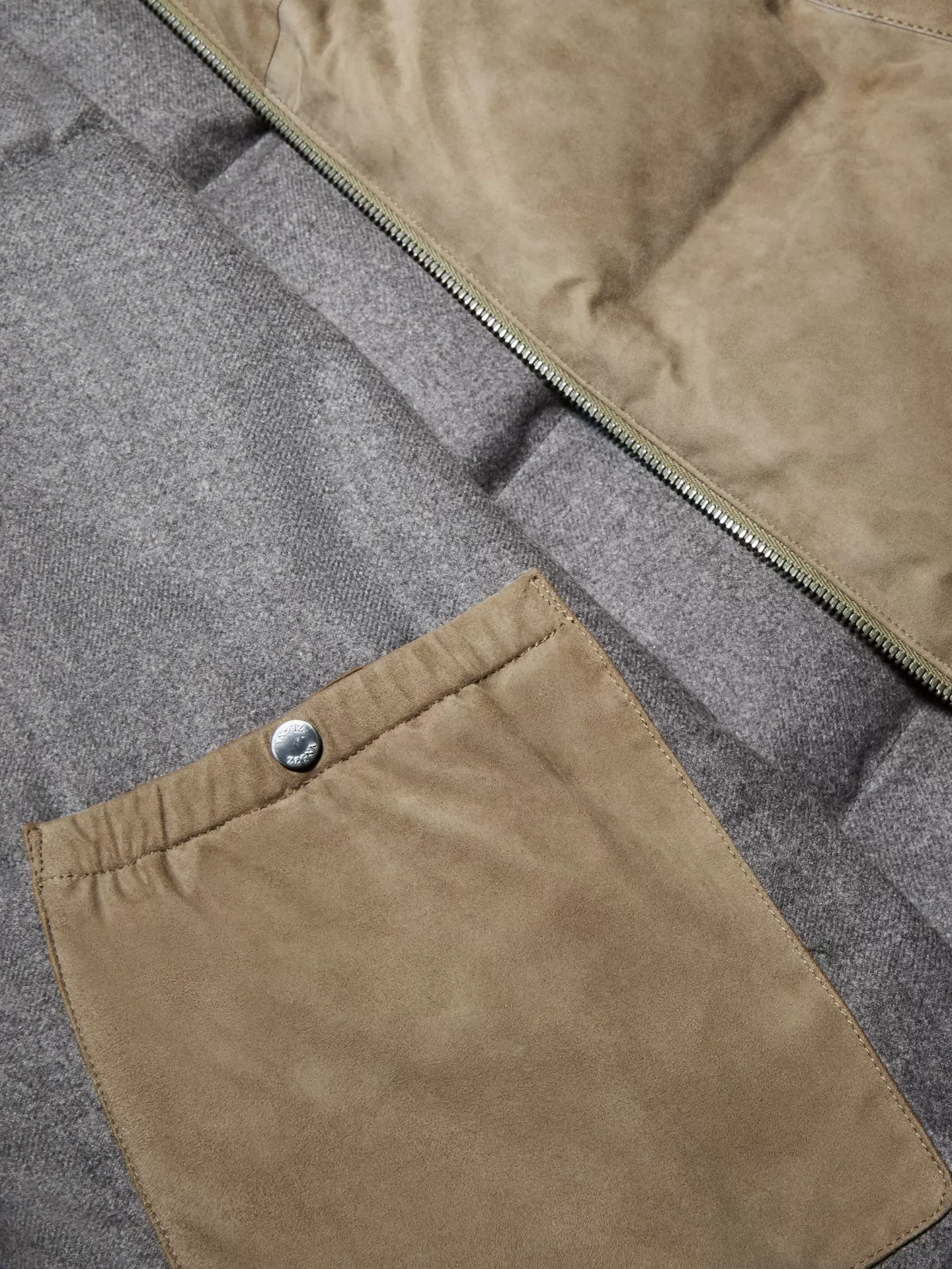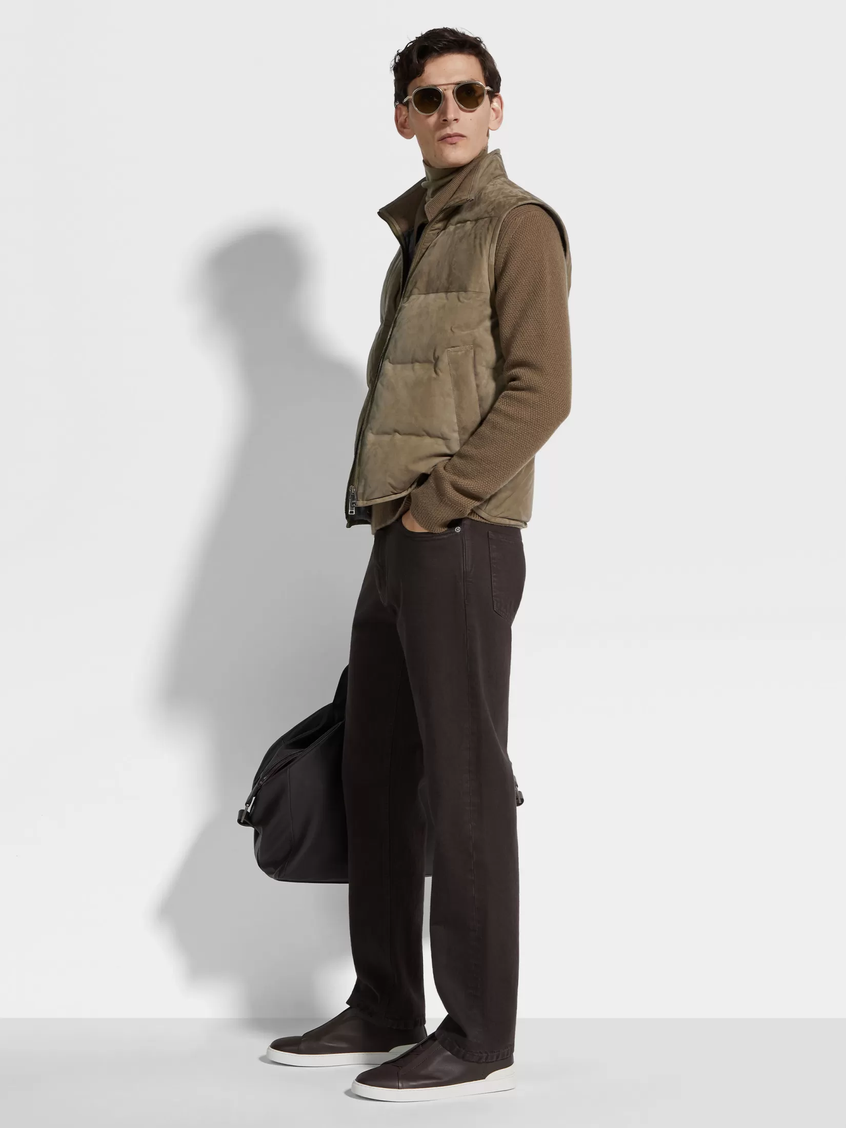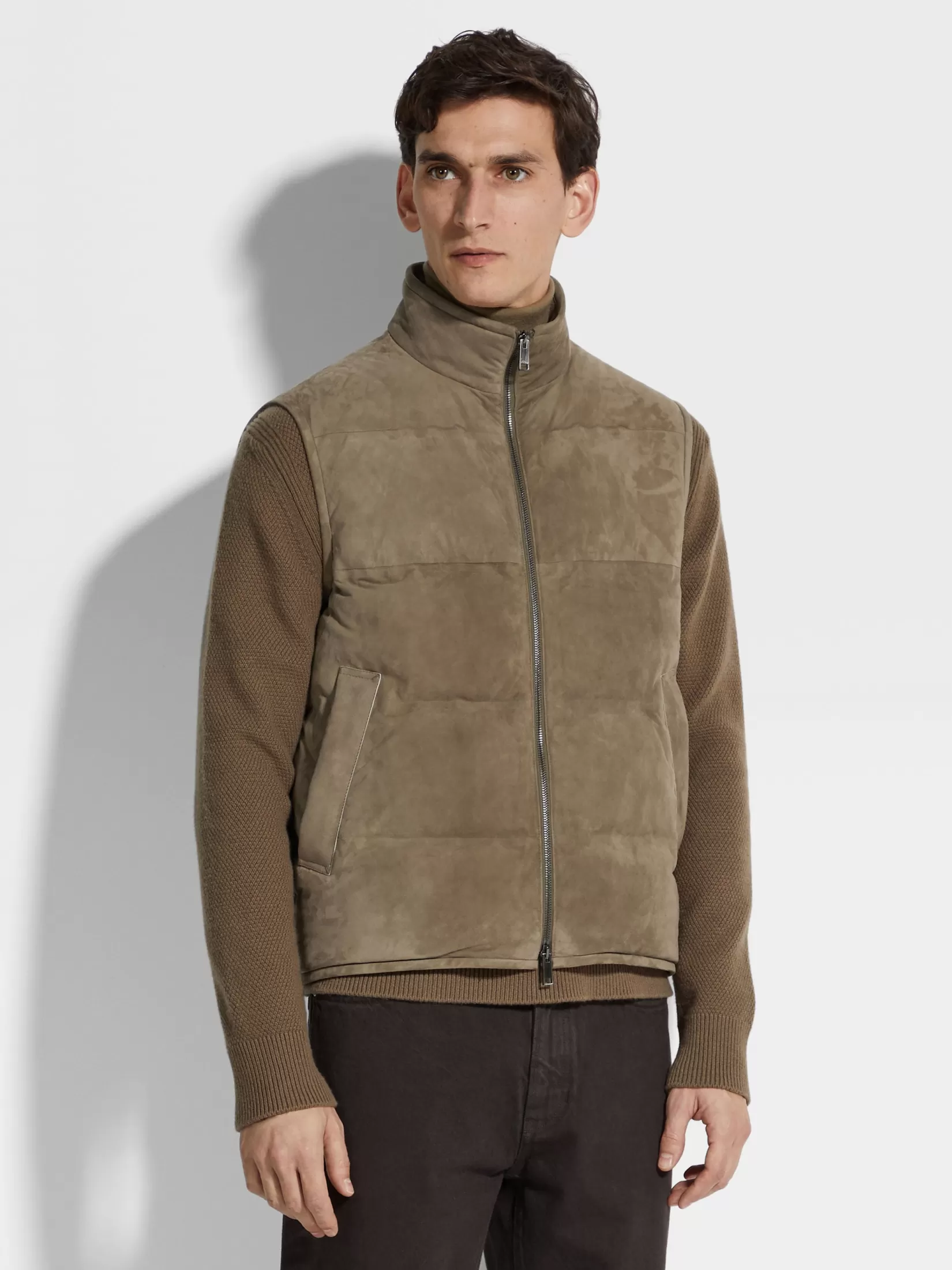 Este chaleco de ante color caqui es suave y liso al tacto, gracias a la calidad inconfundible de su lujosa confección en piel de cordero. El chaleco acolchado se cierra con cremallera y está acabado con un cuello mao. Lo detalles termosellados en los bolsillos completan su diseño esbelto.