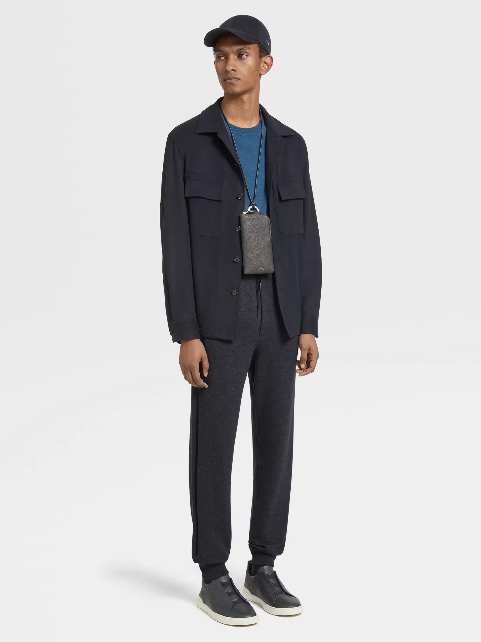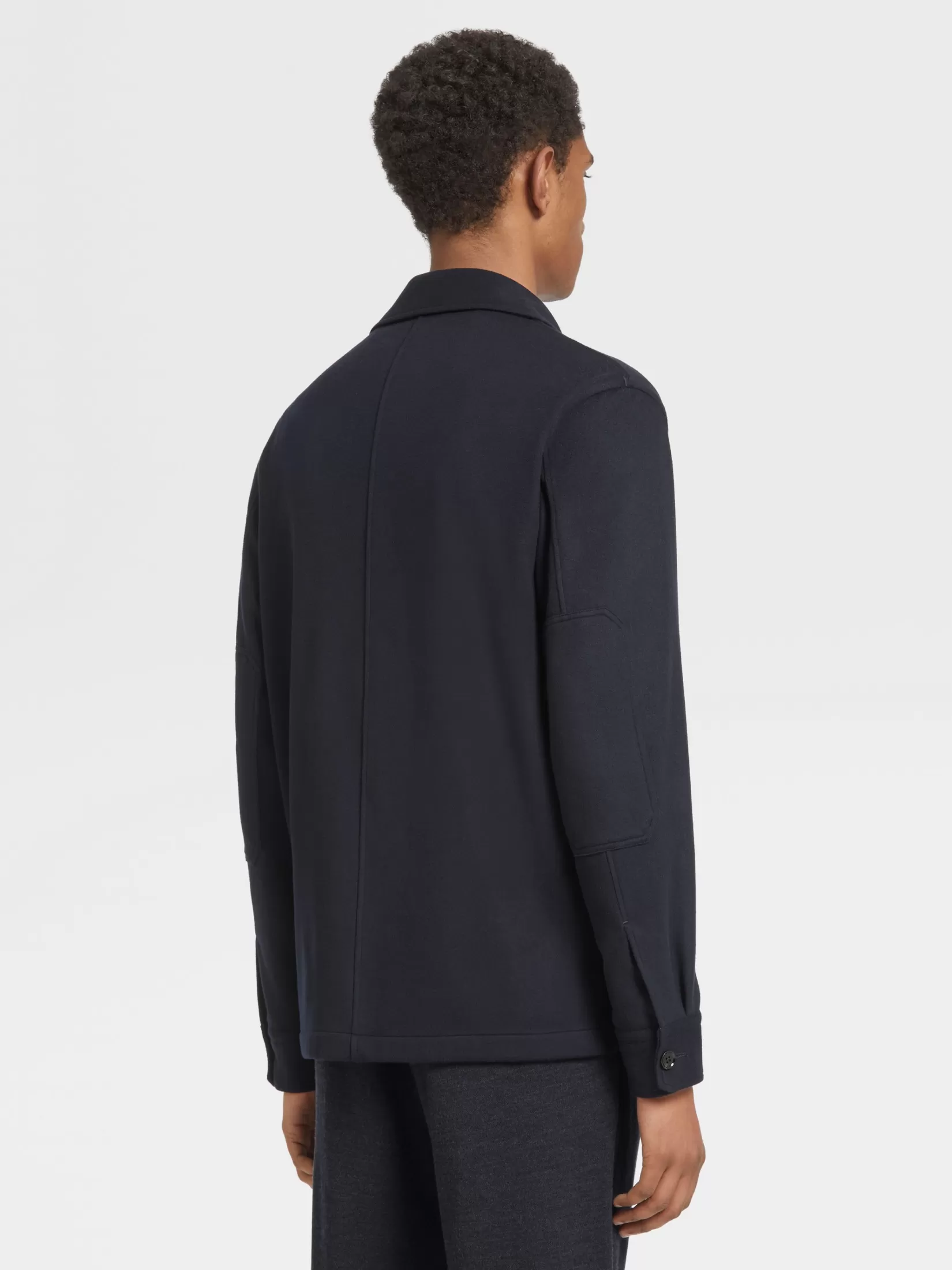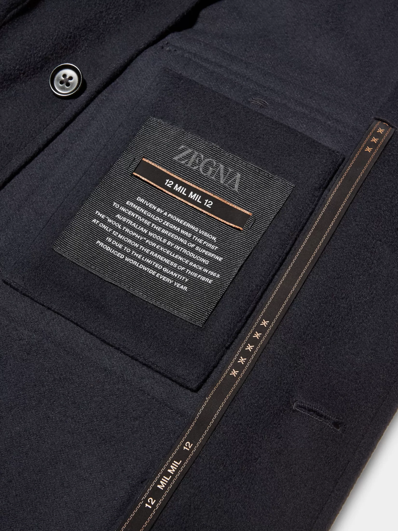La sobrecamisa azul marino está confeccionada en 12milmil12, hecho con lana merino superfina que se produce en cantidades limitadas cada año, y se complementa con el forro de seda. Esta lujosa sobrecamisa está acabada con parches en los codos y bolsillos con solapa para añadirle carácter. El clásico cuello y los puños lisos acaban su diseño.