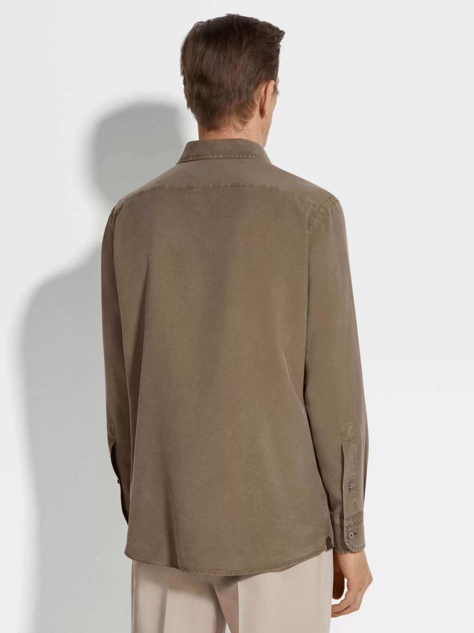 Esta camisa de seda caqui está confeccionada en pura seda Mulberry y está teñida en prenda para un acabado más intenso. La camisa de seda y de manga larga está acabada con el cuello inglés.