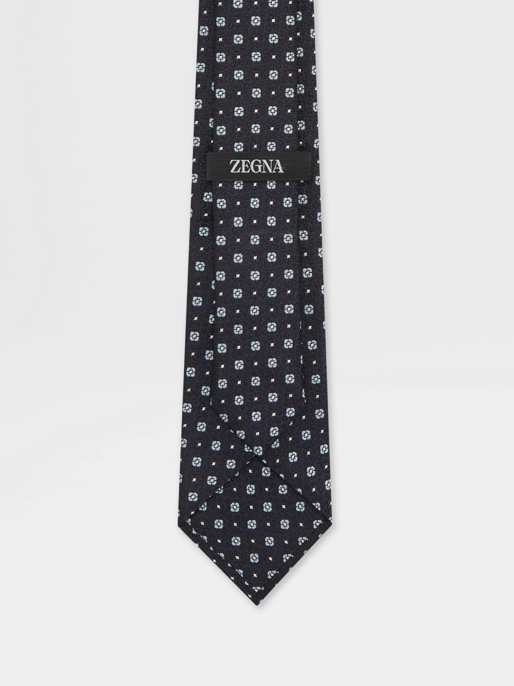 La corbata de seda azul oscuro está confeccionada en seda Mulberry pura. El brillo natural de este tejido hace resalta el atrevido patrón.