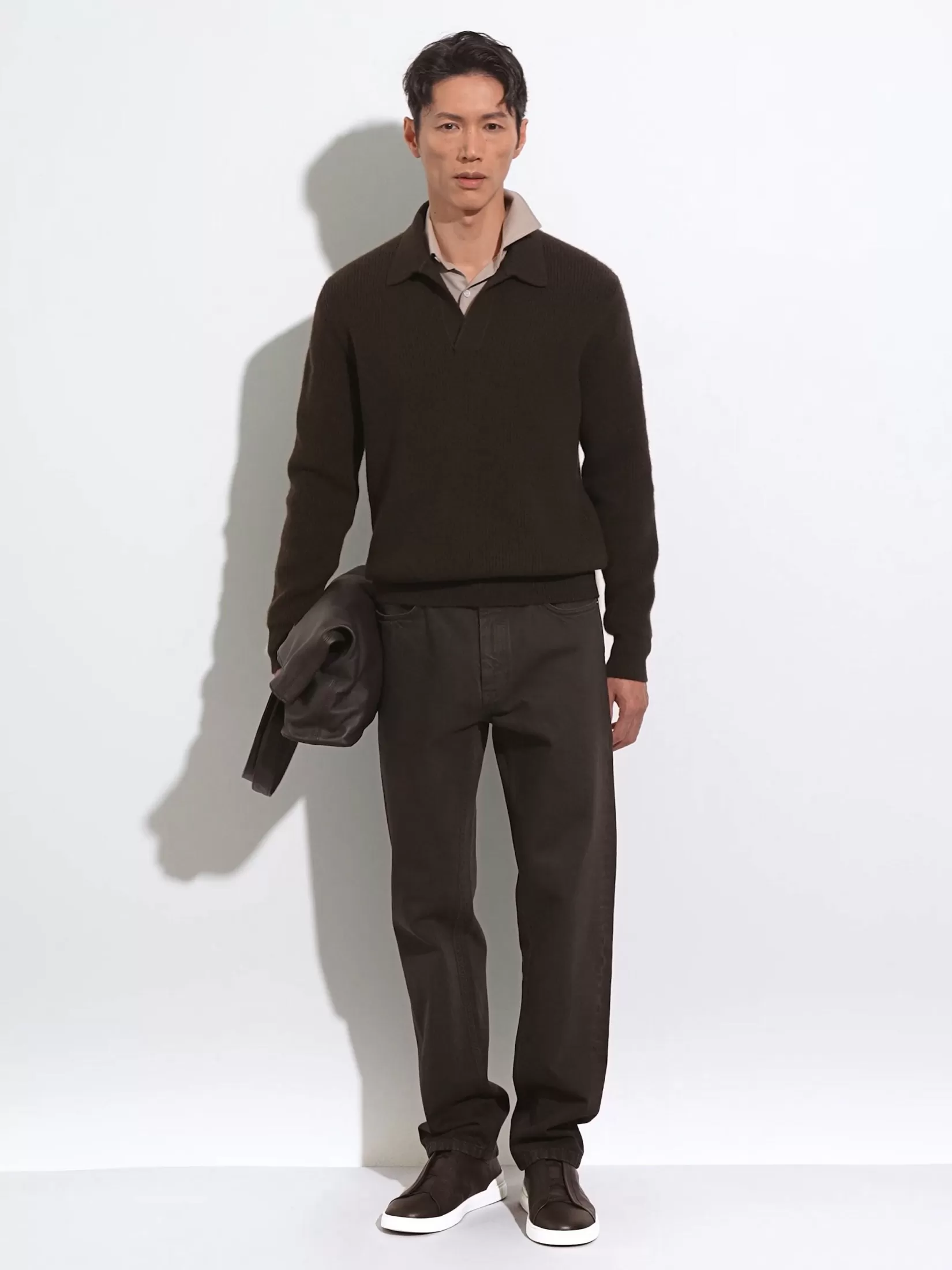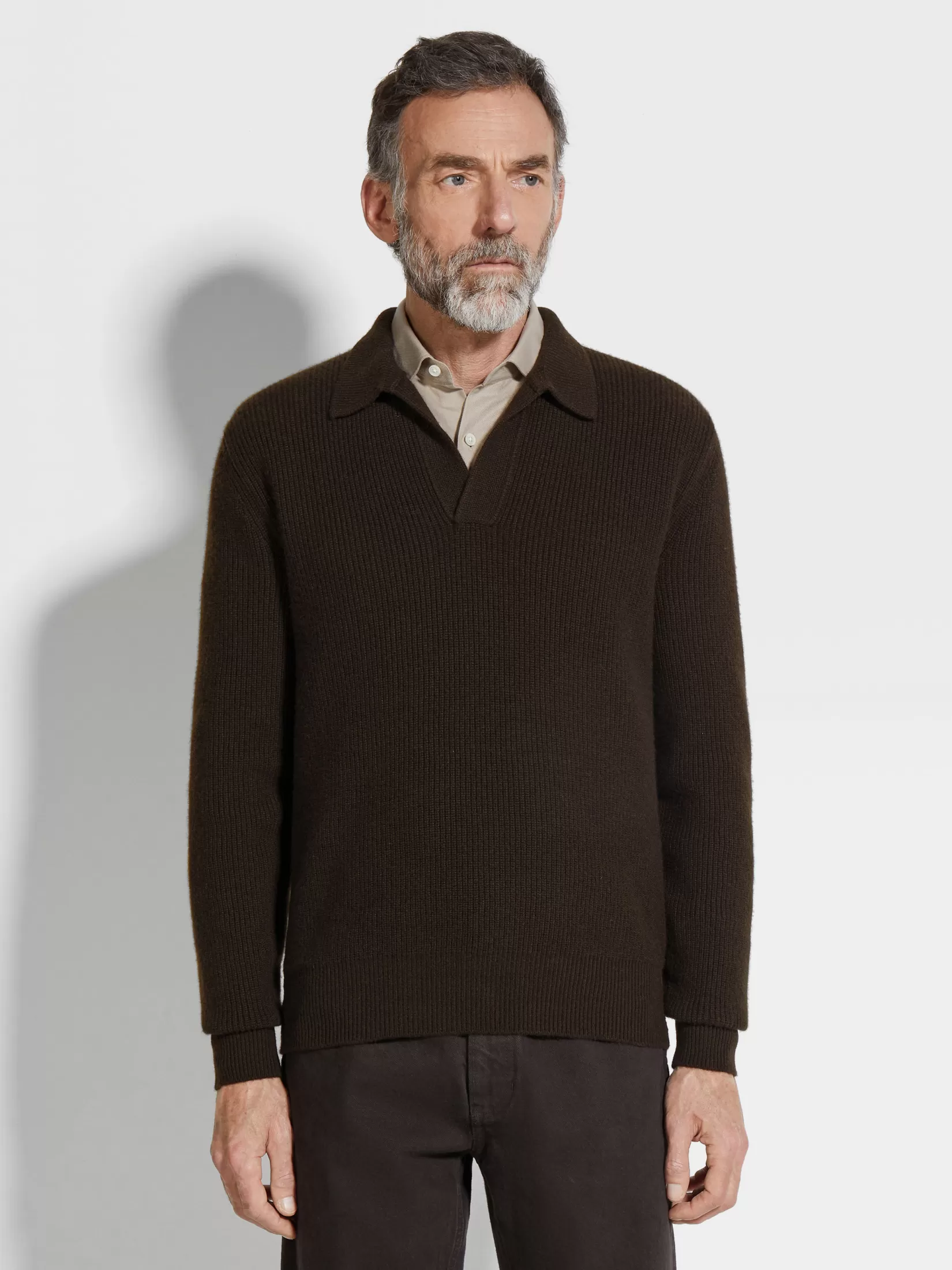 Las fibras de cachemira superfinas se complementan con el color marrón oscuro jaspeado de este polo en Oasi Cashmere. Este polo de manga larga se alinea con la visión del lujo informal de la marca a través del cuello de polo abierto. Los bordes acanalados acaban el diseño.