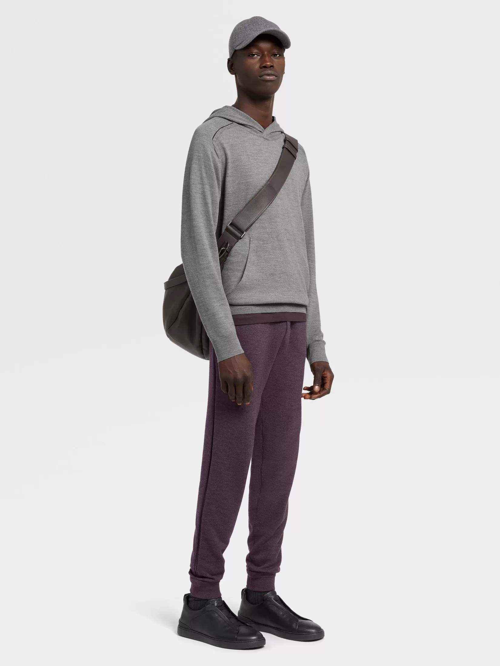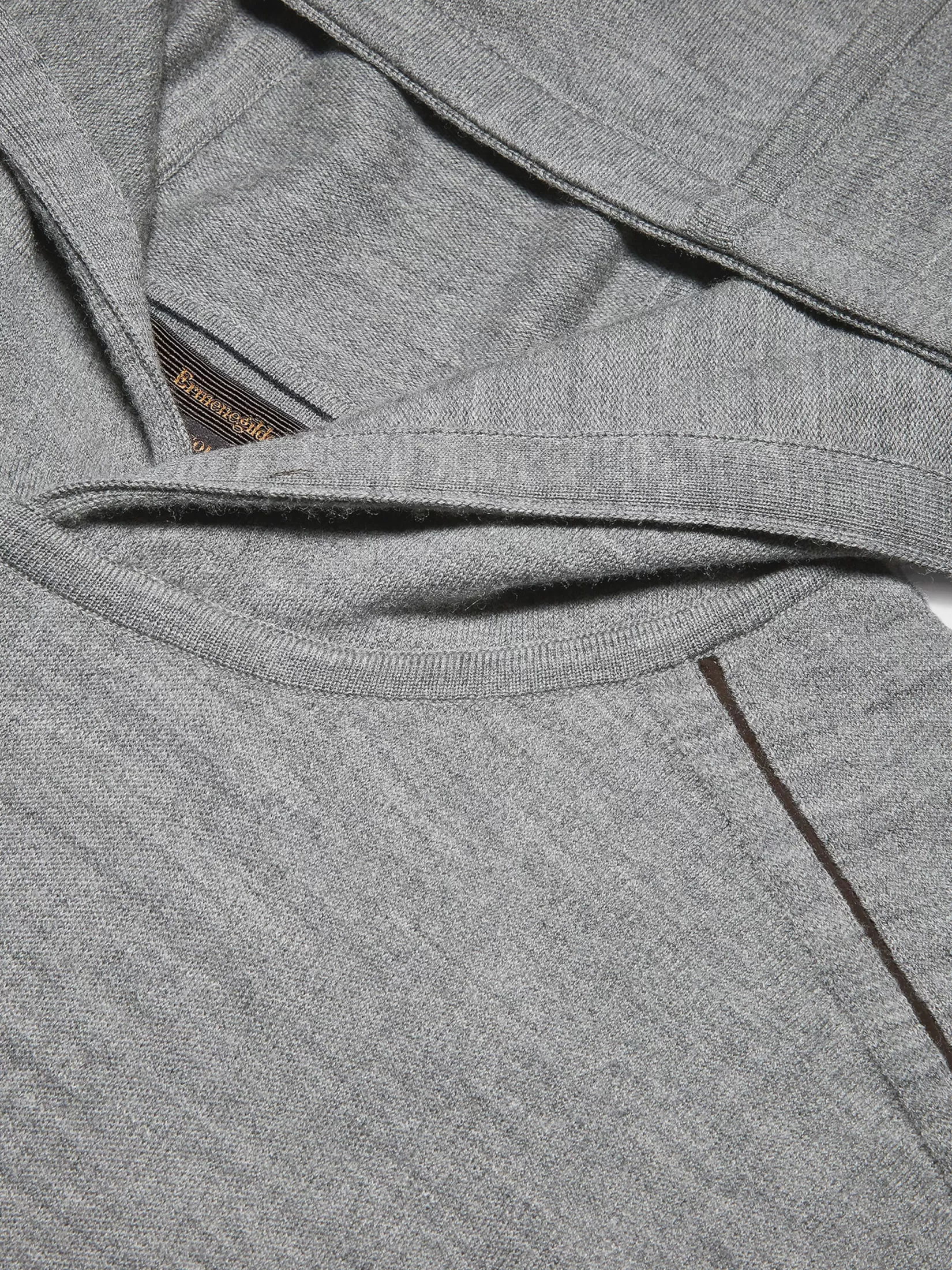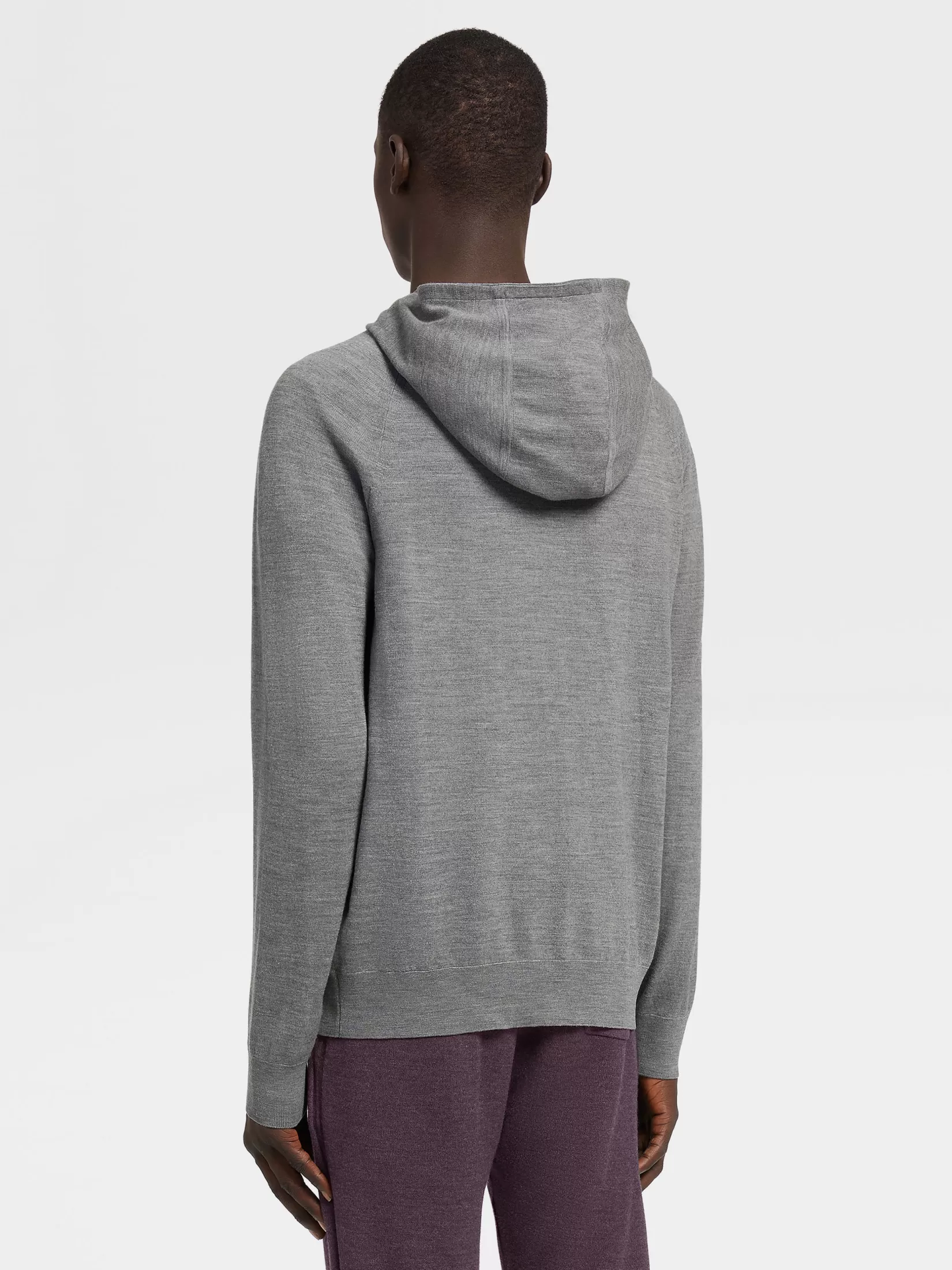 La sudadera con capucha de color gris mixto está confeccionada con la lana 12milmil12 de Zegna, la cual se produce anualmente en cantidades limitadas. Su exquisita suavidad y ligereza se acentúa con los detalles de piel en los hombros. Este modelo está acabado con el clásico bolsillo de canguro por delante.