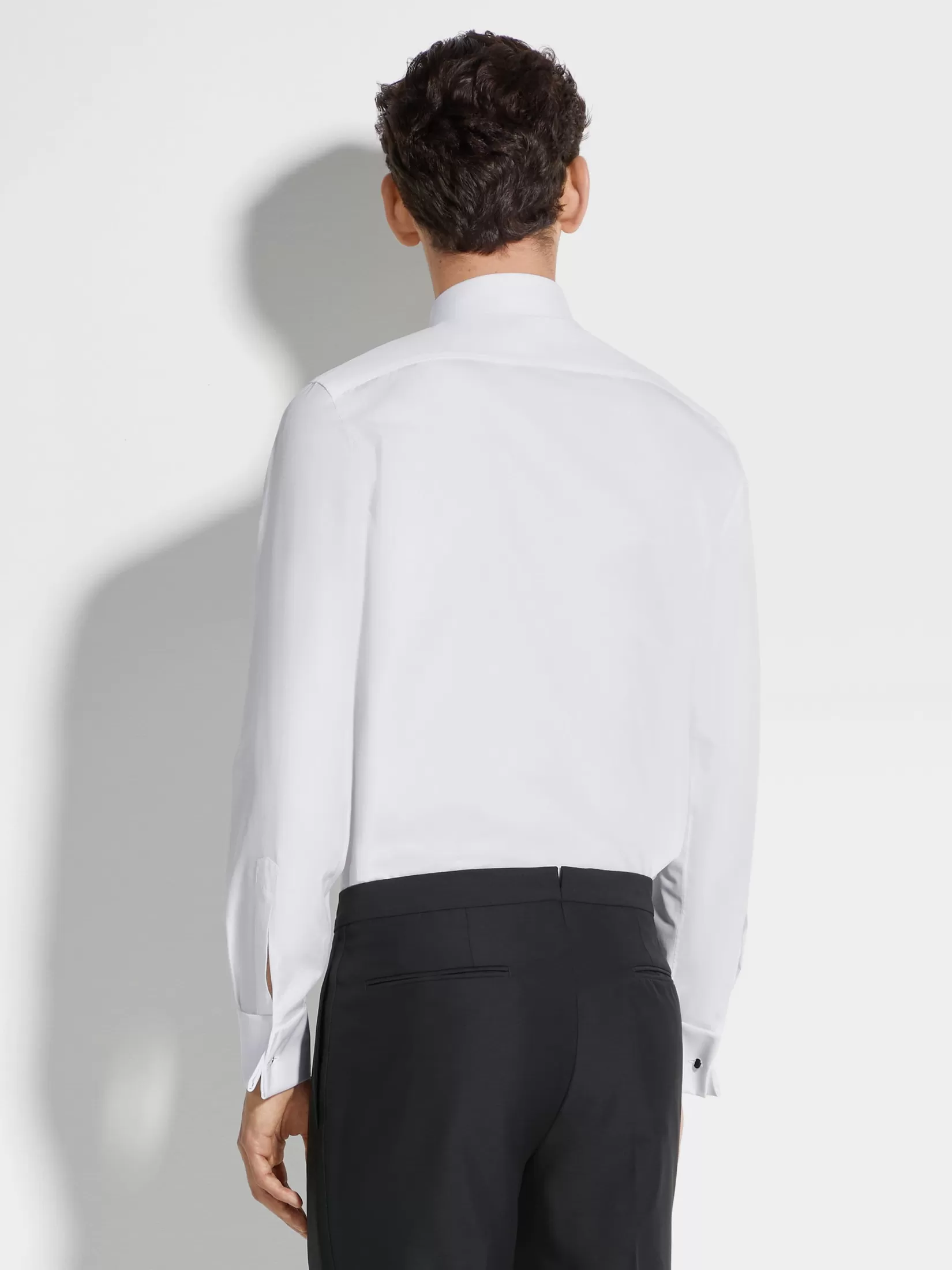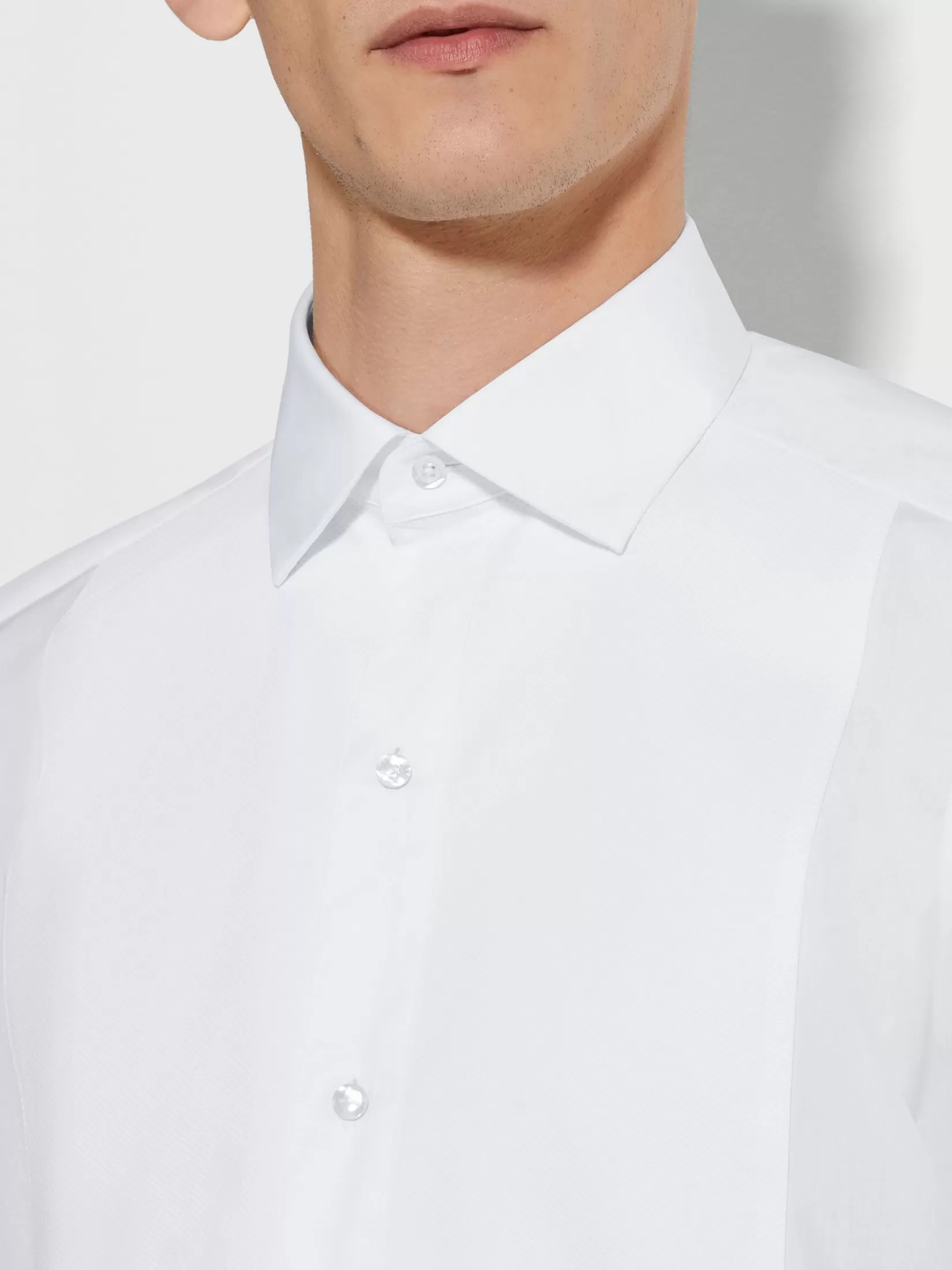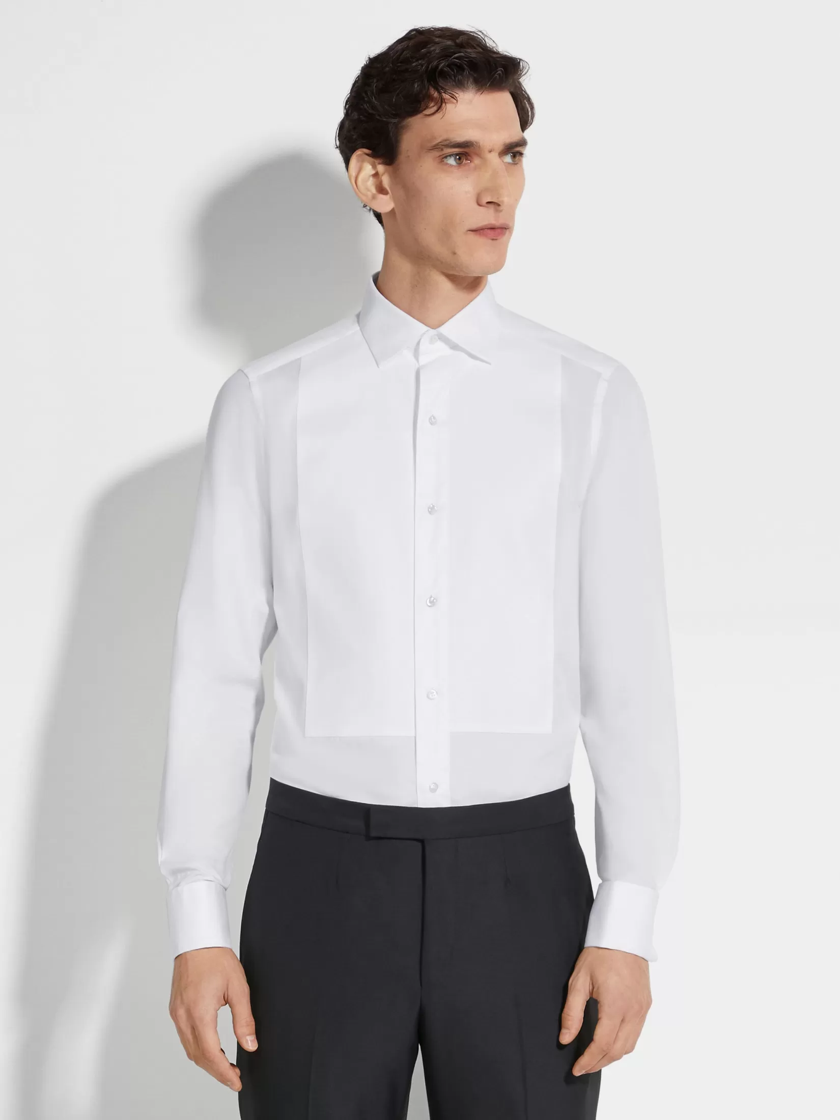 Esta camisa de esmoquin blanco óptico está confeccionada en algodón; la prenda más forma de la colección de alta costura de Zegna. Esta camisa queda impecable con su traje de gala y está acabada con el cuello italiano sobre la pechera.