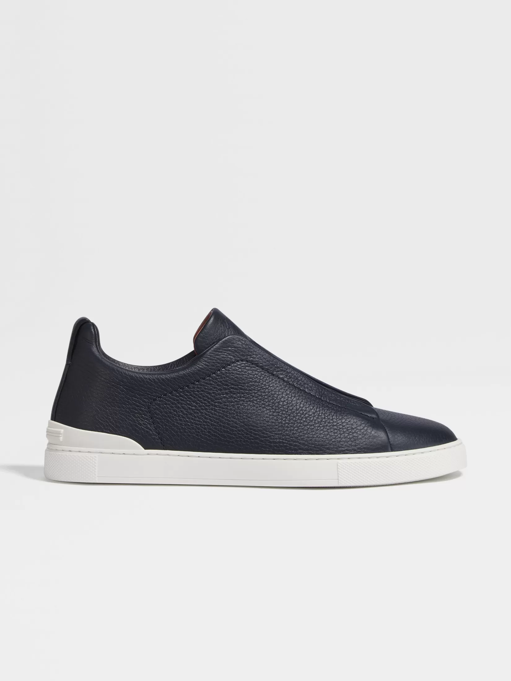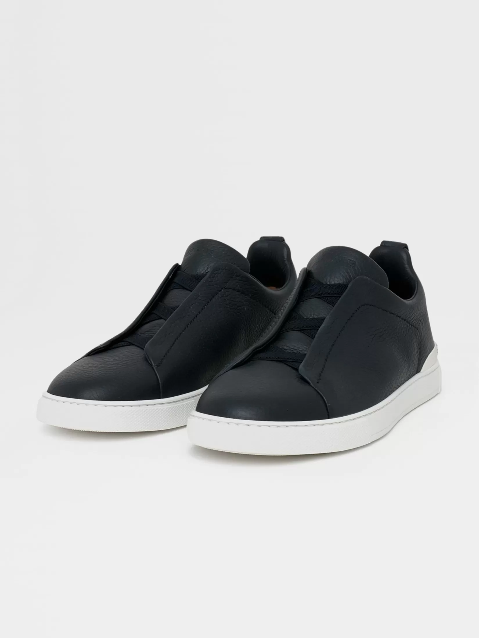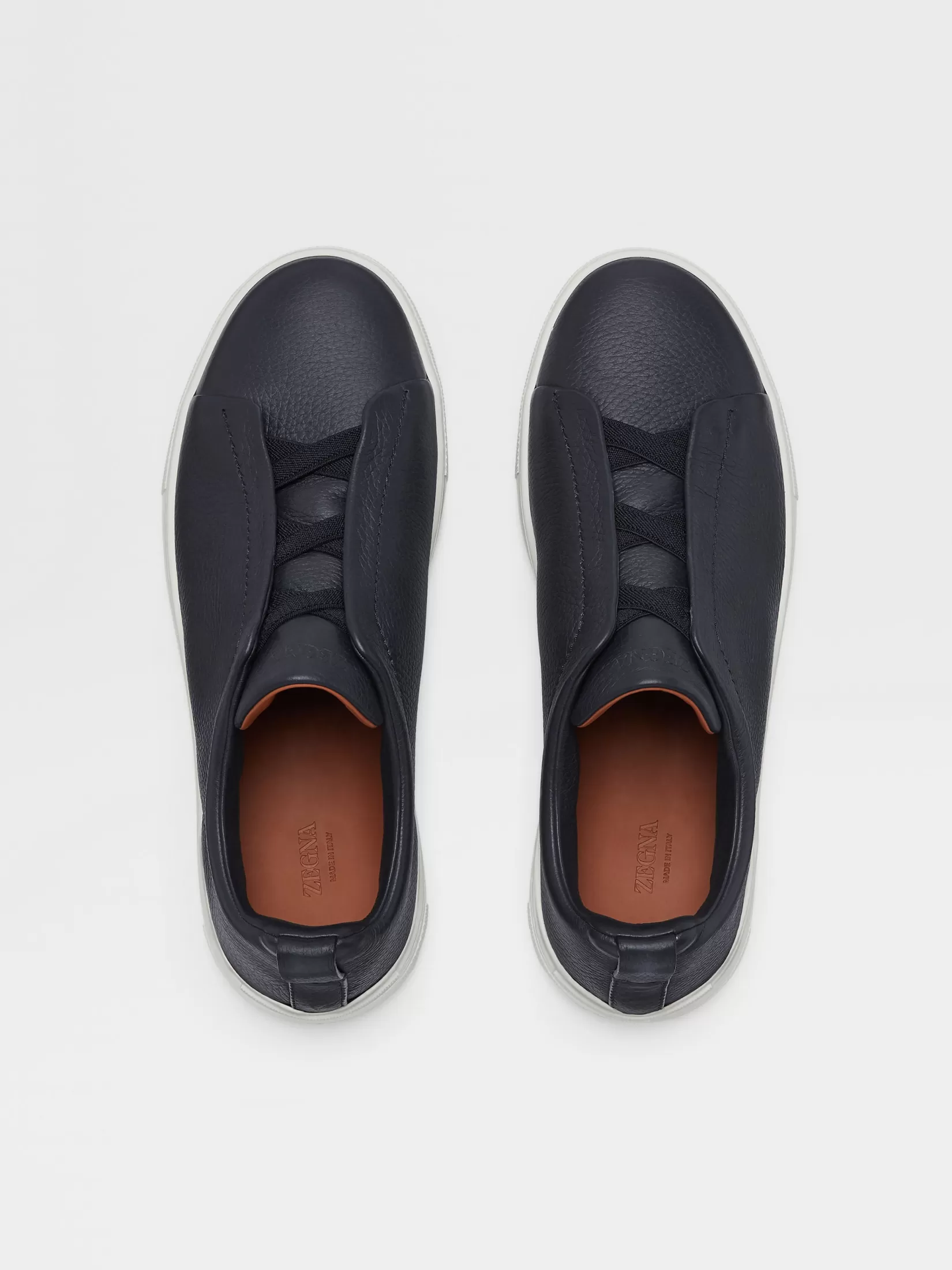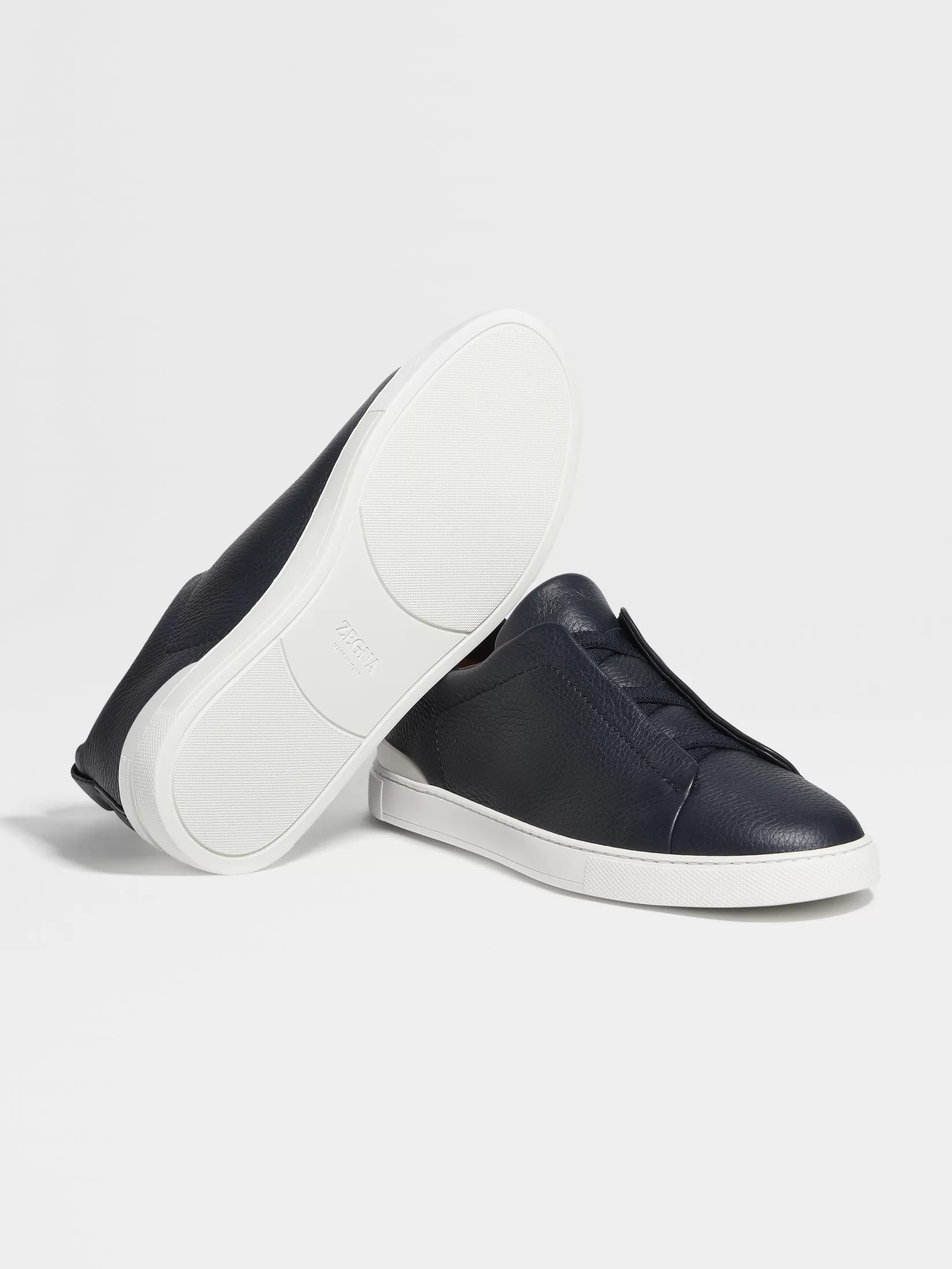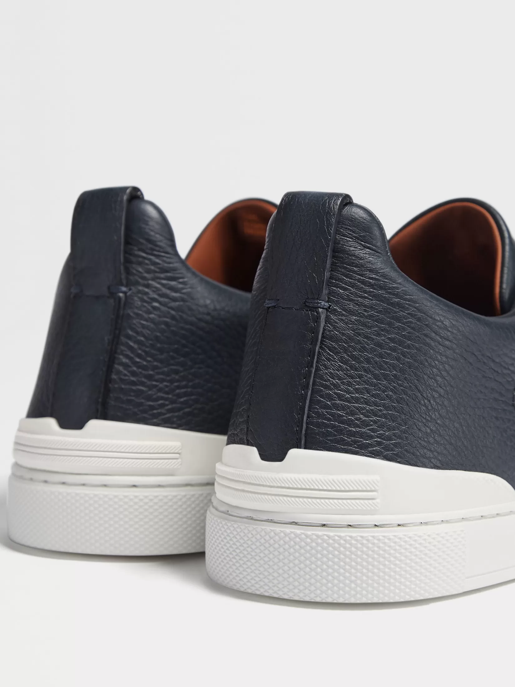 Las zapatillas bajas Triple Stitch™, en piel de ciervo azul marino, se asientan sobre una suela de goma extraligera de color blanco para un toque contrastante. Las icónicas tres cruces elásticas le proporcionan una calzadura simple y fácil, a la vez que evocan los tradicionales pespuntes a mano de las chaquetas sartoriales; un homenaje al legado en la alta costura de Zegna. El forro de piel en color Foliage completa su diseño.